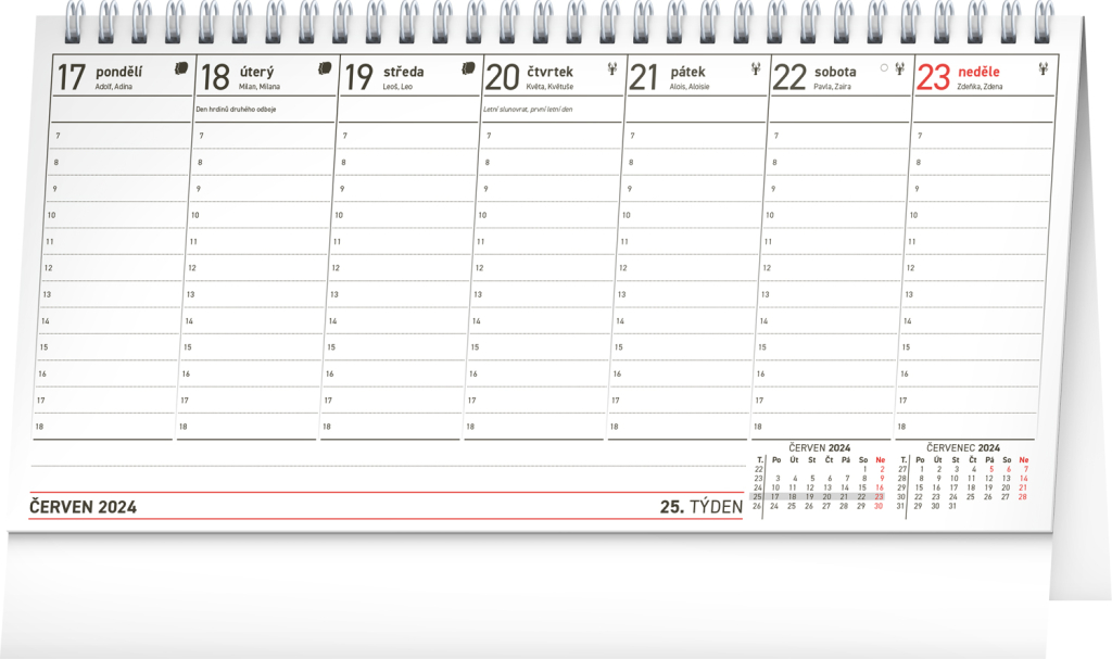 Praktický stolní plánovací kalendář, ve kterém najdete na jednom místě všechny evropské svátky. Sloupcové kalendárium obsahuje státní svátky České republiky, Slovenska, Německa a Velké Británie, česká jména a znamení zvěrokruhu.