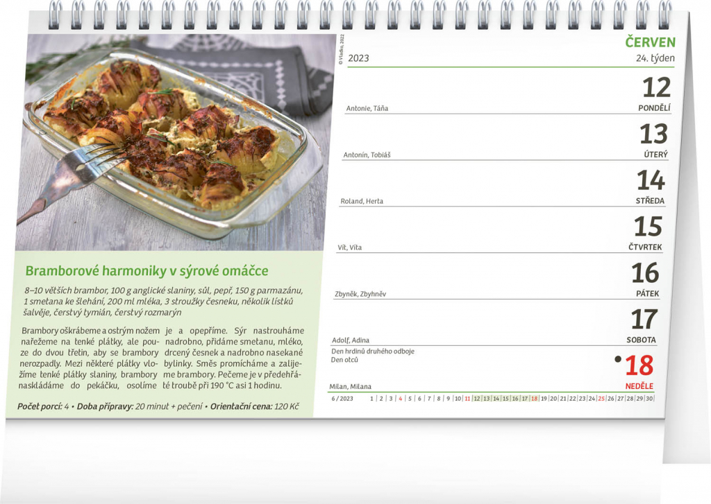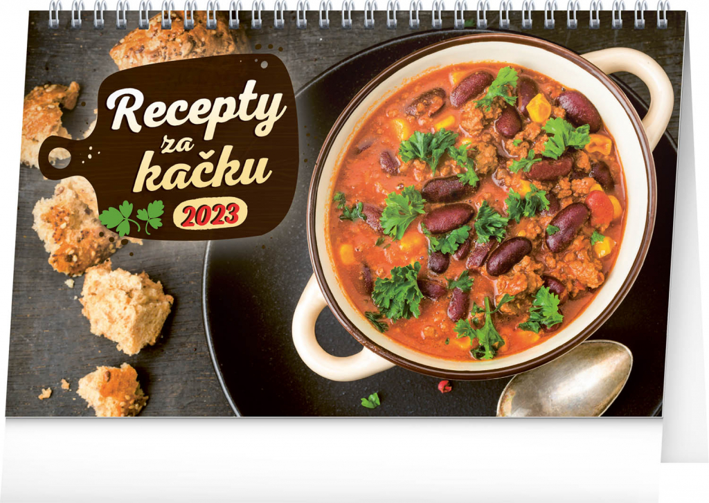 Zajímá vás, jak uvařit chutné a jednoduché jídlo? Stolní kalendář Recepty za kačku nabízí 53 takových tipů! V tomto kalendáři se navíc dozvíte i důležitou informaci o ceně, na kterou vás jídlo vyjde. Sami se budete moci přesvědčit, že vařit se dá chutně a zároveň levně. Týdenní kalendárium s prostorem pro poznámky obsahuje také svátky, památné dny, fáze měsíce a přehled na celý rok.