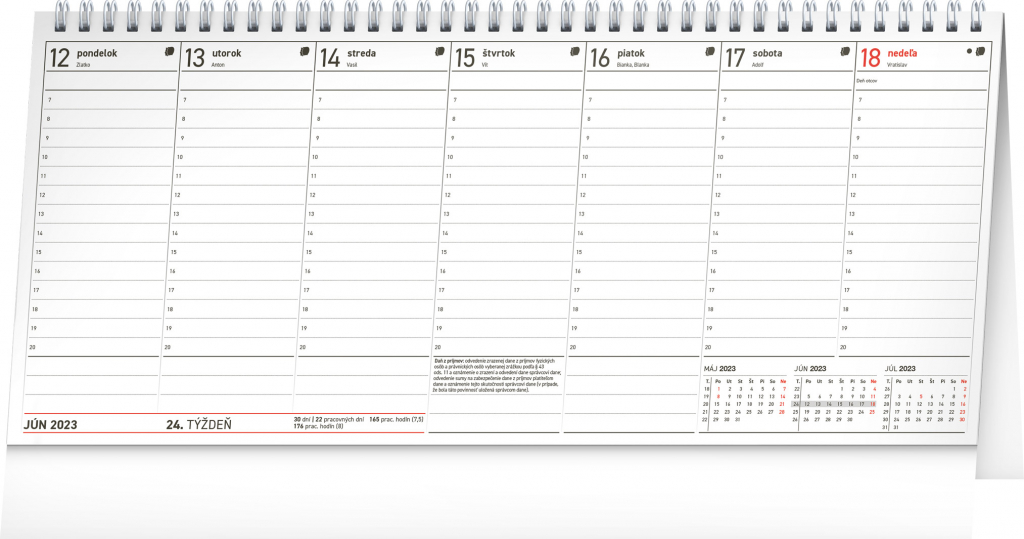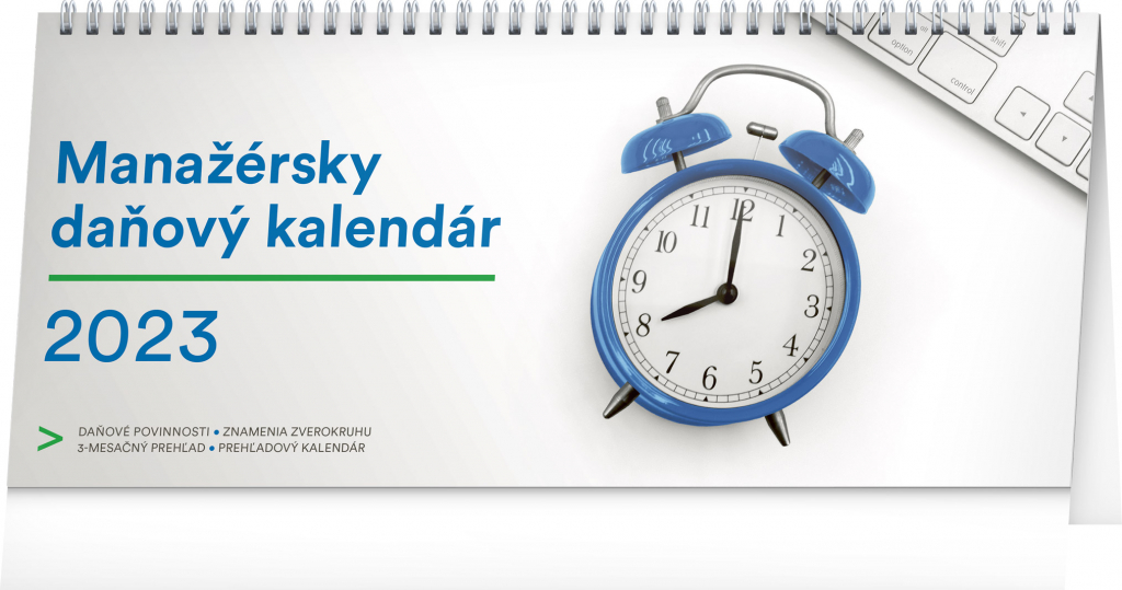 Stolní kalendář se sloupcovým kalendáriem obsahuje všechny termíny daňových povinností, slovenská jména, svátky a památné dny a tříměsíční přehled u každého týdne. S tímto kalendářem již nezapomenete na žádnou svou schůzku či jednání, a ještě vám zbyde dostatek místa na další poznámky a záznamy.
