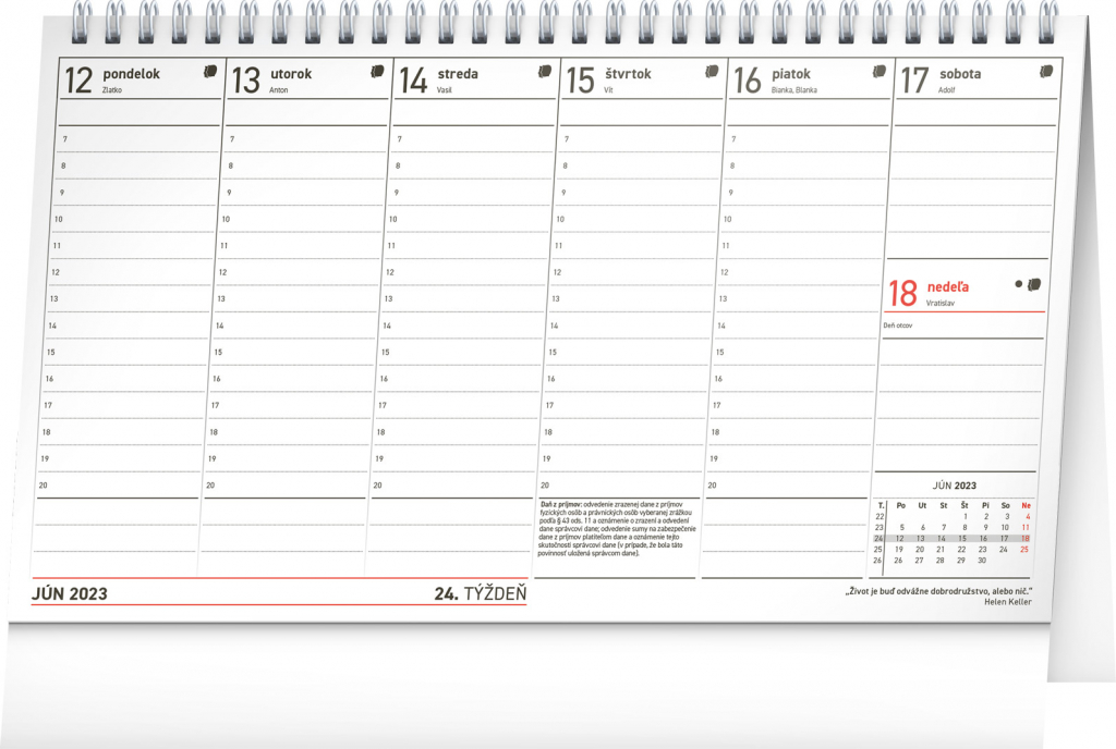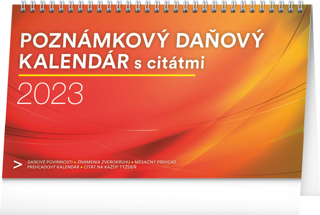 Přehledný daňový kalendář, díky kterému nezapomenete na žádnou daňovou povinnost, a navíc se seznámíte s řadou zajímavých citátů slavných osobností. Sloupcové kalendárium obsahuje měsíční přehled v každém týdnu, znamení zvěrokruhu, slovenská jména, svátky a památné dny.