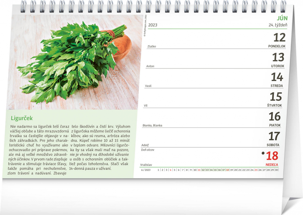 Na stránkách stolního kalendáře najdete výběr nejrozmanitějších bylinek a koření. Dozvíte se zde spoustu informací i o rostlinách, o kterých jste ani netušili, že mají léčivé vlastnosti. Fotografie doplňuje slovenské týdenní kalendárium se jmény, svátky a památnými dny.