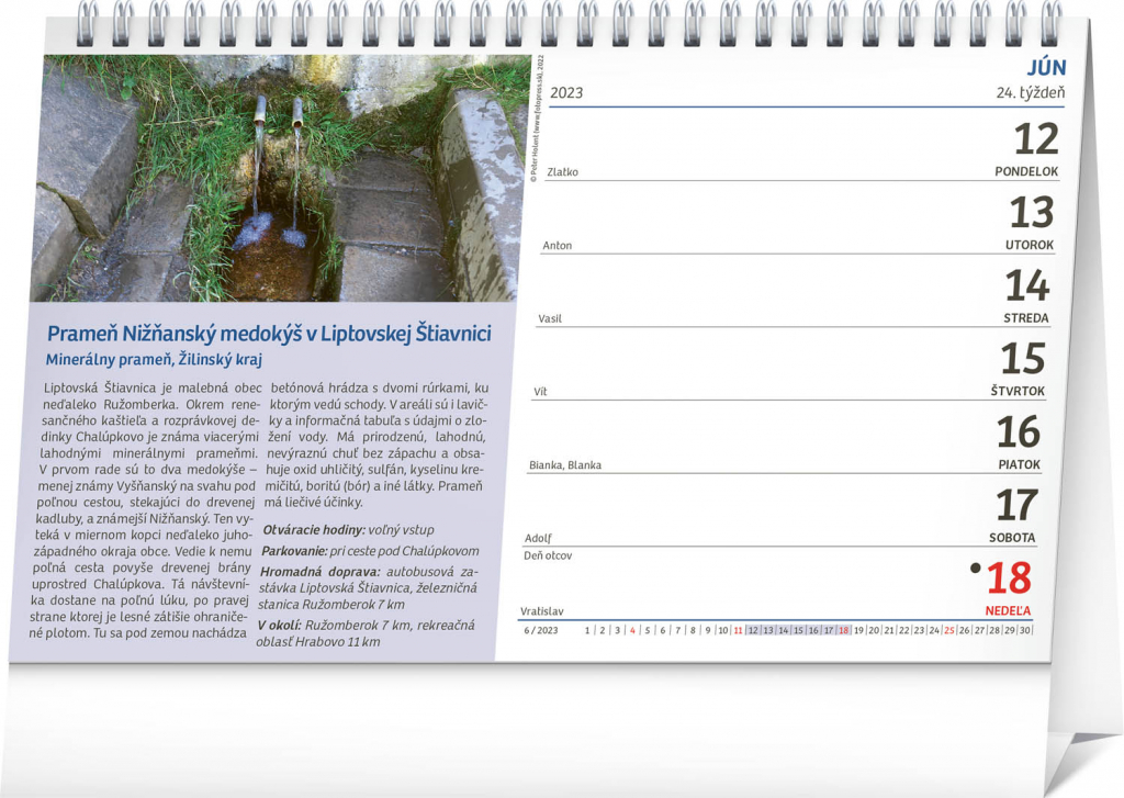 Dochází vám nápady a fantazie, kam vyrazit na výlet? V našem stolním kalendáři naleznete 53 tipů pro vaše nová dobrodružství. Ideální a praktický kalendář, který bude pomocníkem pro všechny víkendové výletníky. Stačí si jen vybrat cíl vaší příští cesty. Fotografie z jednotlivých míst doplňuje slovenské týdenní kalendárium.