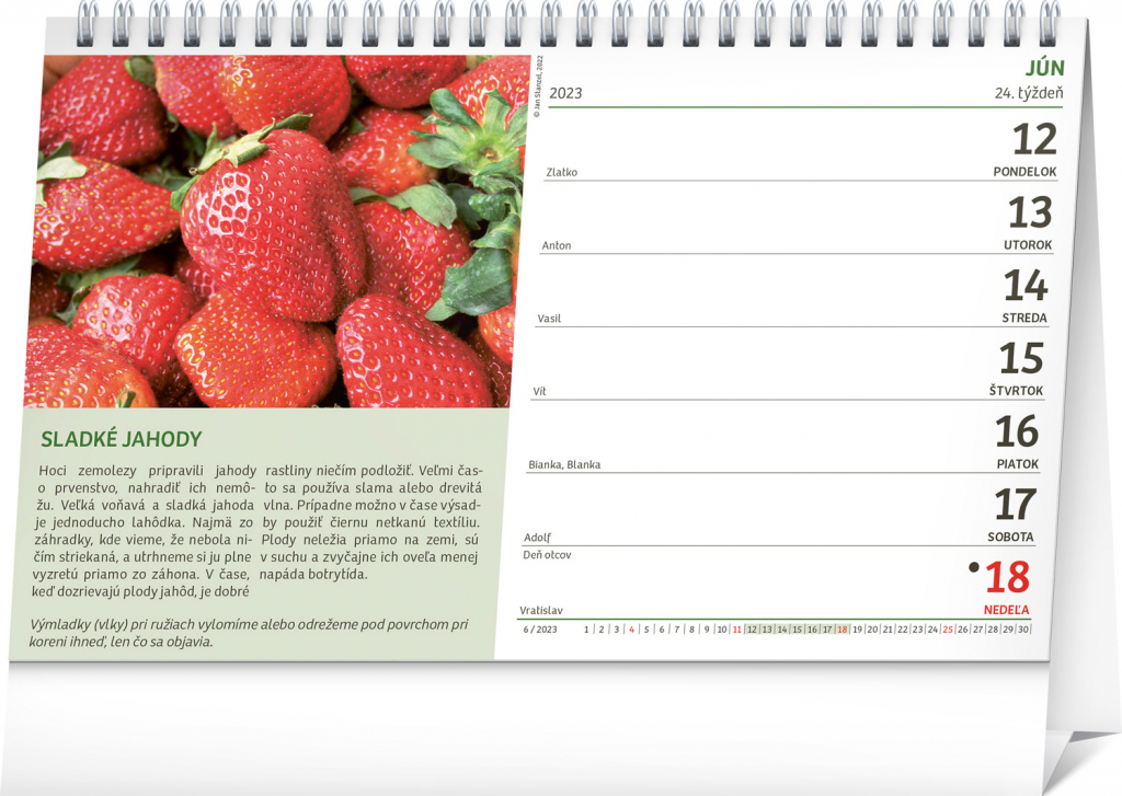 Praktický stolní kalendář plný užitečných rad a tipů pro úspěšné zahrádkáře. Na zahradě je celý rok co dělat. S naším kalendářem se detailně seznámíte se sezónními zahrádkářskými pracemi a najdete zde i řadu tipů, které vám zaručí hojnější úrodu. Praktický a přehledný kalendář vás seznámí s tím "co a kdy" je nejlepší udělat pro vaši milovanou zahradu či zahrádku. Stolní kalendář se slovenským kalendáriem obsahuje svátky a památné dny, fáze měsíce a přehled na celý rok 2023.