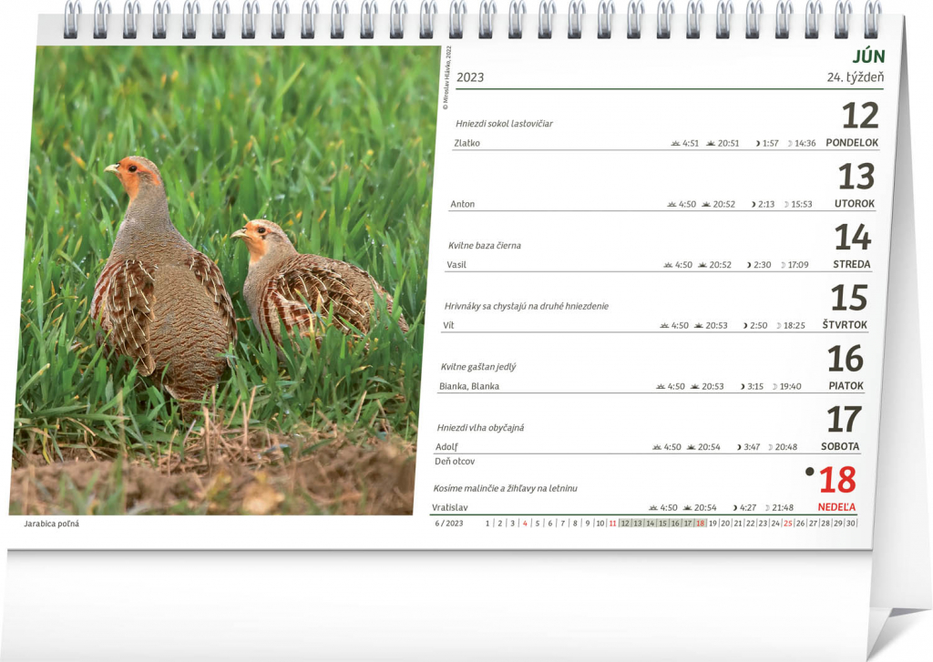 Oblíbený stolní kalendář obsahuje spoustu důležitých informací pro každého myslivce. Naleznete zde doby východu a západu slunce a měsíce na Slovensku, informace o aktivitách zvěře a přírodních aktualitách v průběhu roku a také přehled o době lovu srstnaté a pernaté zvěře. Tyto praktické informace doplňují nádherné fotky divoké zvěře od fotografa Miroslava Hlávka a kalendárium se slovenskými jmény, svátky a památnými dny.