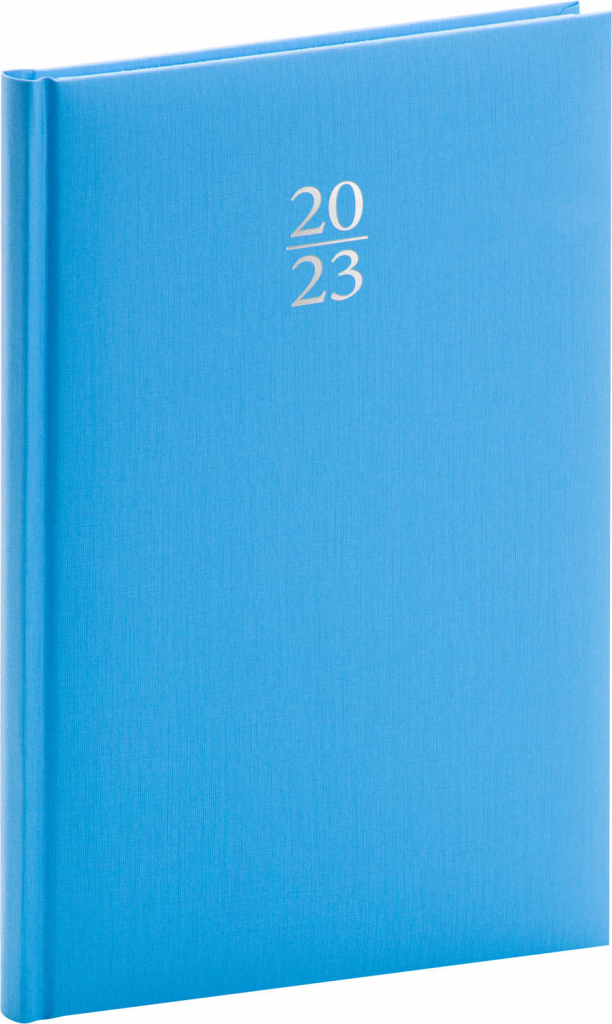 Týdenní diář Capys 2023 ve světle modré barvě. Povrch imitující jemnou strukturu plátna je vhodný pro ražbu přes fólii. Atraktivní barevný odstín doplňuje ražba letopočtu. Týdenní rozvrh s česko-slovenským kalendáriem a doplňkovou angličtinou, němčinou, maďarštinou a ruštinou.