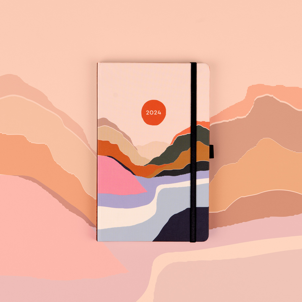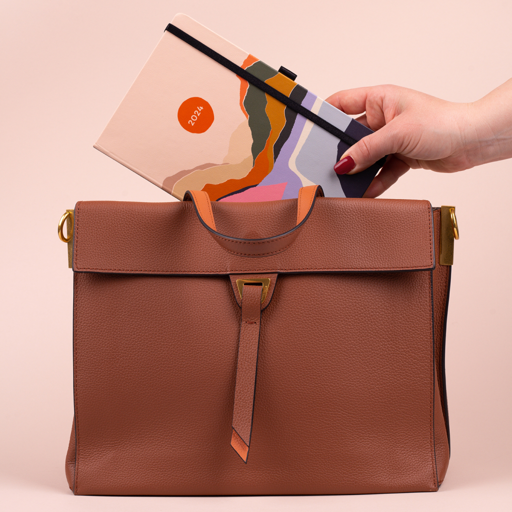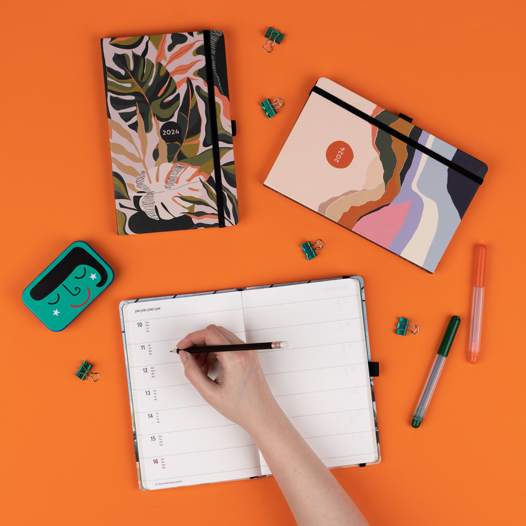 Šestijazyčný týdenní diář s uzavíráním na gumičku obsahuje přehled mezinárodních svátků, přehled roku 2024 a 2025, adresář a kapsičku na zadní předsádce. Řádkové rozvržení s prostorem pro poznámky na každý den.