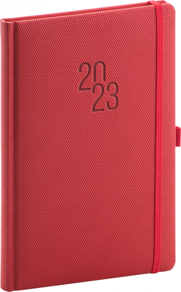 Luxusní týdenní diář Diamante 2023 v červené barvě. Povrch s jemnou strukturou připomínající výbrus diamantu je vhodný pro všechny typy ražeb. Diář má zakulacené rohy, poutko na tužku a elastickou gumičku, sloužící k pevnému uzavření.
