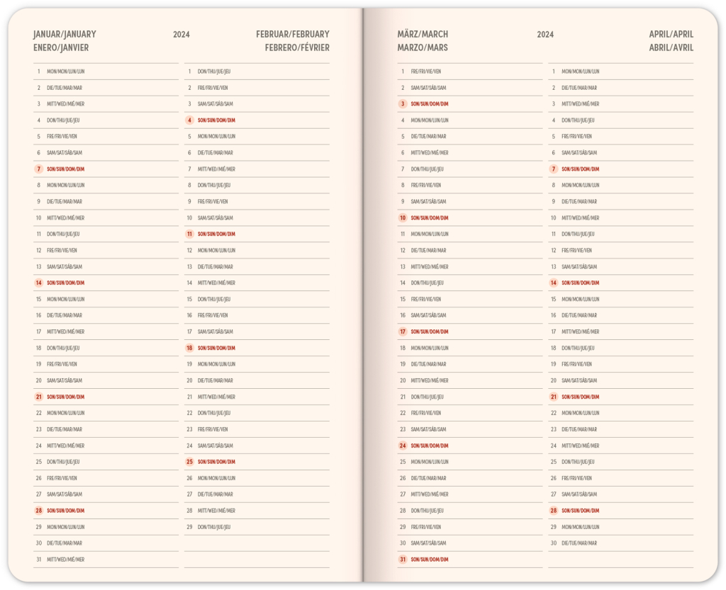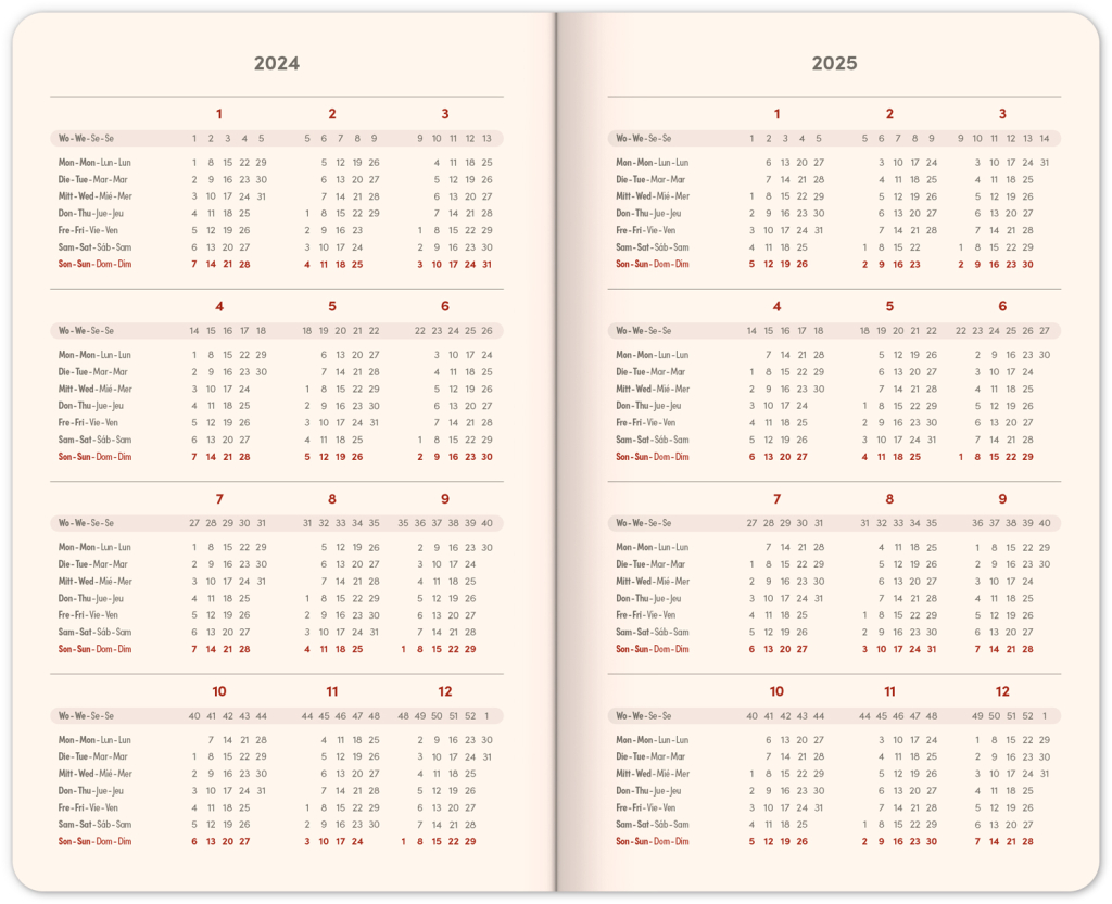 Šestijazyčný týdenní diář s uzavíráním na gumičku obsahuje přehled mezinárodních svátků, přehled roku 2024 a 2025, adresář a kapsičku na zadní předsádce. Řádkové rozvržení s prostorem pro poznámky na každý den.