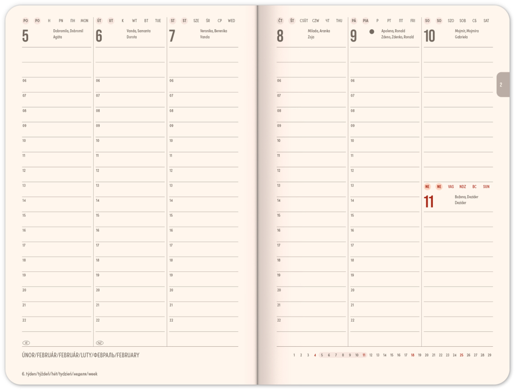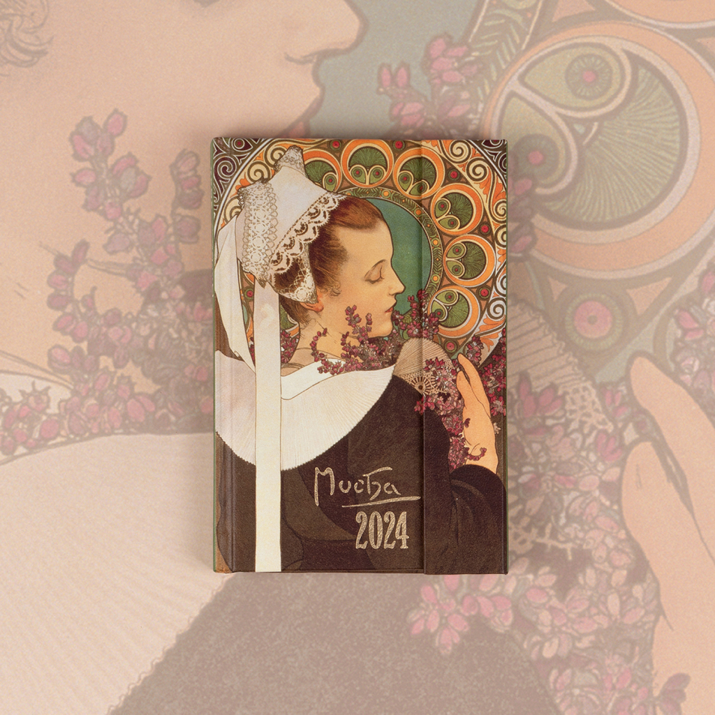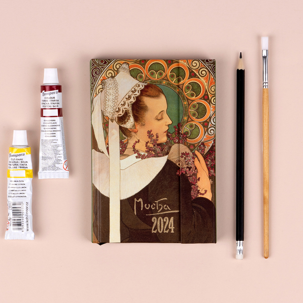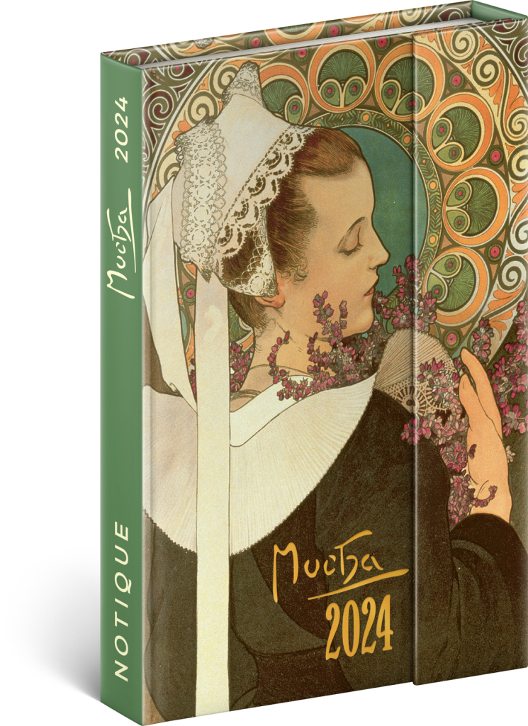 Šestijazyčný týdenní diář s magnetickým uzavíráním obsahuje přehled mezinárodních svátků, seznam českých a slovenských jmen, přehled roku 2024 a 2025, adresář a kapsičku na zadní předsádce. Sloupcové rozvržení s prostorem pro poznámky na každý den. Diář doplňují obrazy oblíbeného secesního malíře Alfonse Muchy.