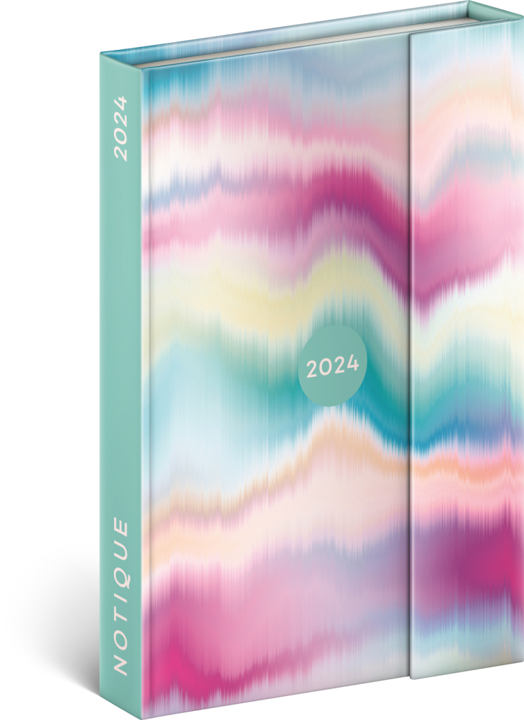 Šestijazyčný týdenní diář s magnetickým uzavíráním obsahuje přehled mezinárodních svátků, seznam českých a slovenských jmen, přehled roku 2024 a 2025, adresář a kapsičku na zadní předsádce. Sloupcové rozvržení s prostorem pro poznámky na každý den.