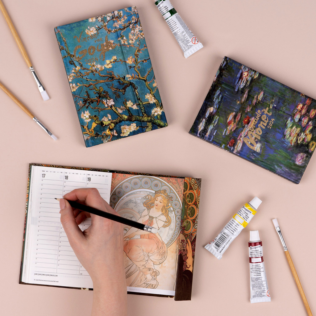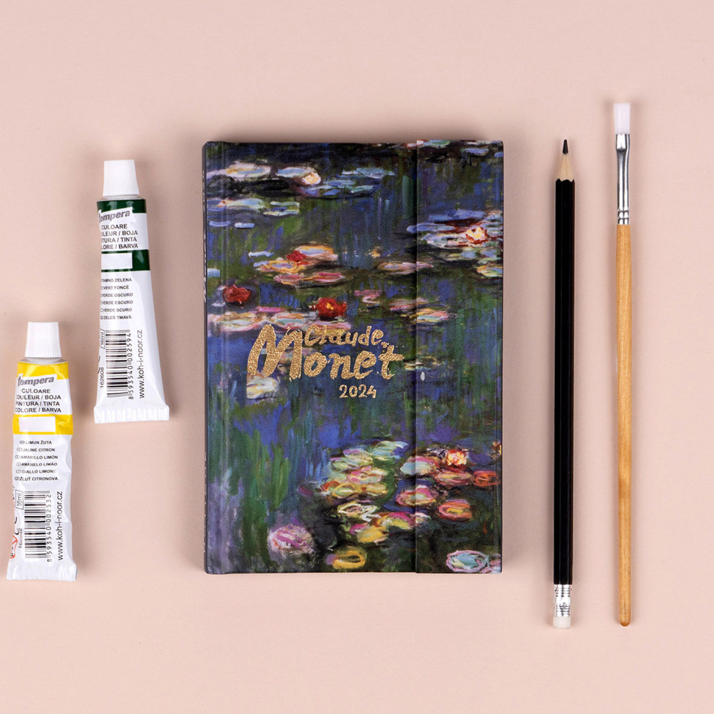 Šestijazyčný týdenní diář s magnetickým uzavíráním obsahuje přehled mezinárodních svátků, seznam českých a slovenských jmen, přehled roku 2024 a 2025, adresář a kapsičku na zadní předsádce. Sloupcové rozvržení s prostorem pro poznámky na každý den. Diář doplňují obrazy malíře Clauda Moneta.