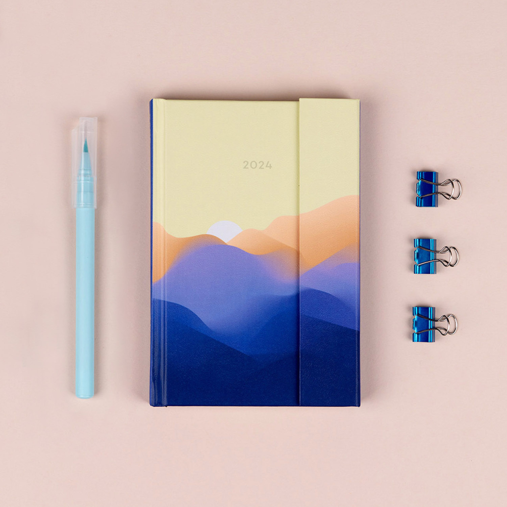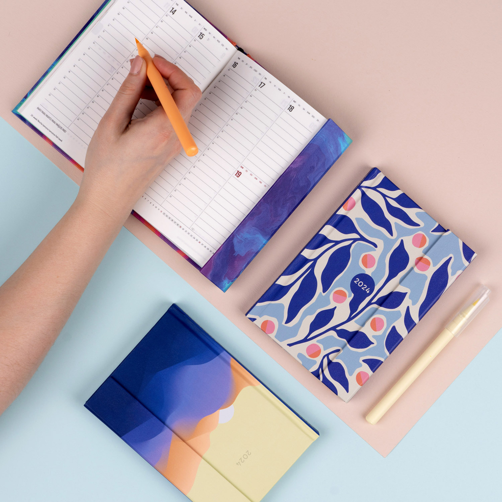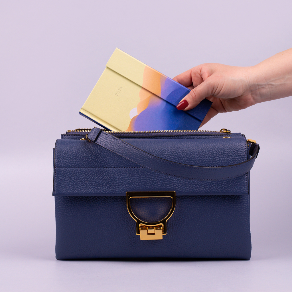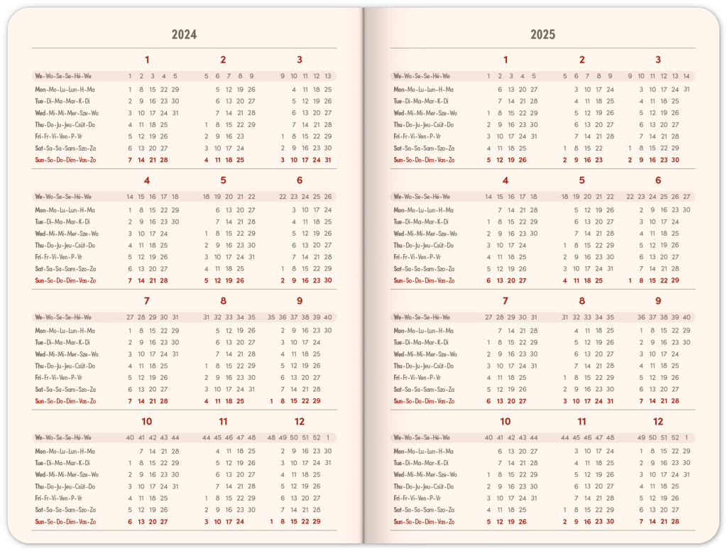 Šestijazyčný týdenní diář s magnetickým uzavíráním obsahuje přehled mezinárodních svátků, seznam českých a slovenských jmen, přehled roku 2024 a 2025, adresář a kapsičku na zadní předsádce. Sloupcové rozvržení s prostorem pro poznámky na každý den.