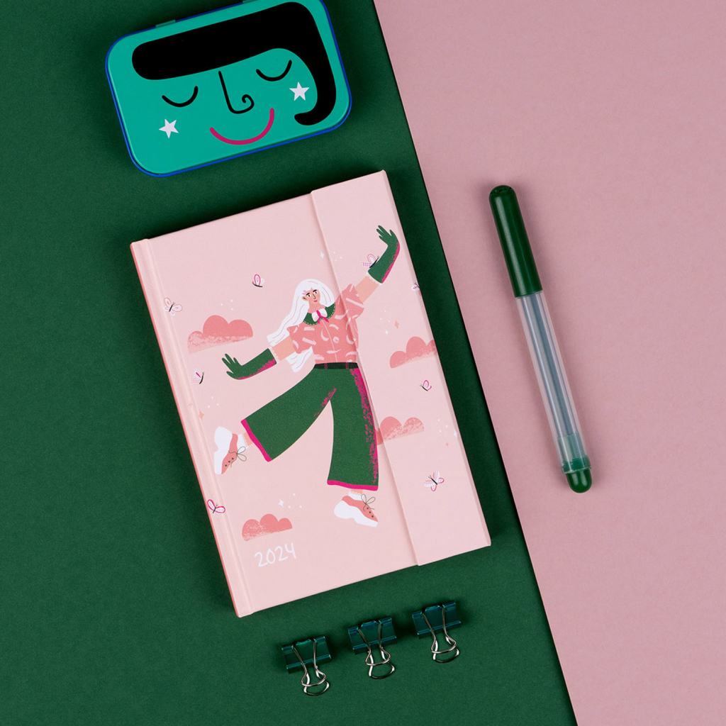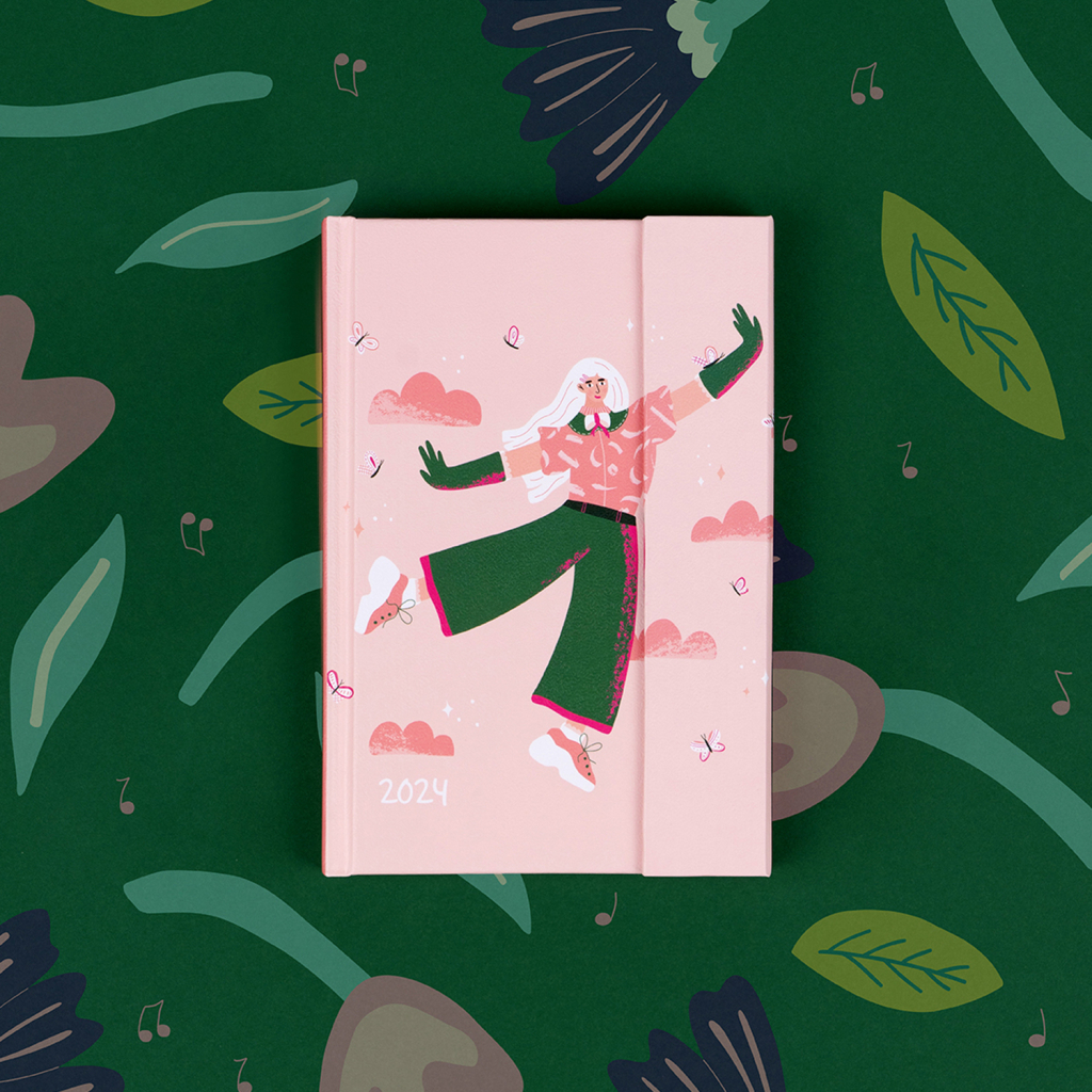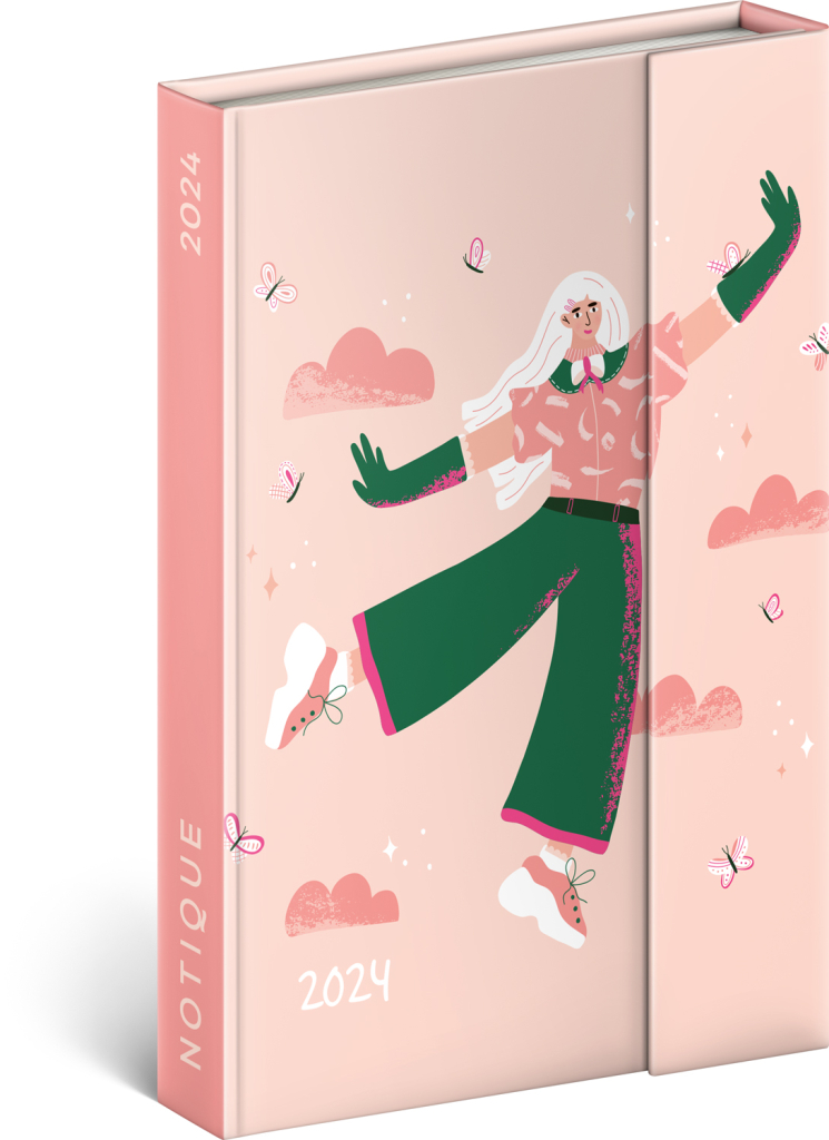 Šestijazyčný týdenní diář s magnetickým uzavíráním obsahuje přehled mezinárodních svátků, seznam českých a slovenských jmen, přehled roku 2024 a 2025, adresář a kapsičku na zadní předsádce. Sloupcové rozvržení s prostorem pro poznámky na každý den.