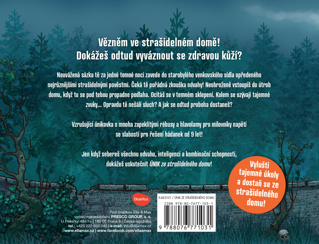 Neuvážená sázka vás za jedné temné noci zavede do starobylého venkovského sídla, opředeného nejrůznějšími strašidelnými pověstmi. Čeká vás pořádná zkouška odvahy! Neohroženě vstoupíte do útrob domu, když tu se pod vámi propadne podlaha. Ocitáte se v temném sklepení. Kolem se ozývají tajemné zvuky... Opravdu vás nešálí sluch? A jak se odtud proboha dostanete? Jste vězněm ve strašidelném domě – dokážete odtud vyváznout se zdravou kůží? Vzrušující únikovka plná zapeklitých rébusů a hlavolamů pro milovníky dobrodružných příběhů se slabostí pro řešení hádanek! Jen když seberete všechnu odvahu, inteligenci a kombinační schopnosti, dokážete uskutečnit ÚNIK… ze strašidelného domu!