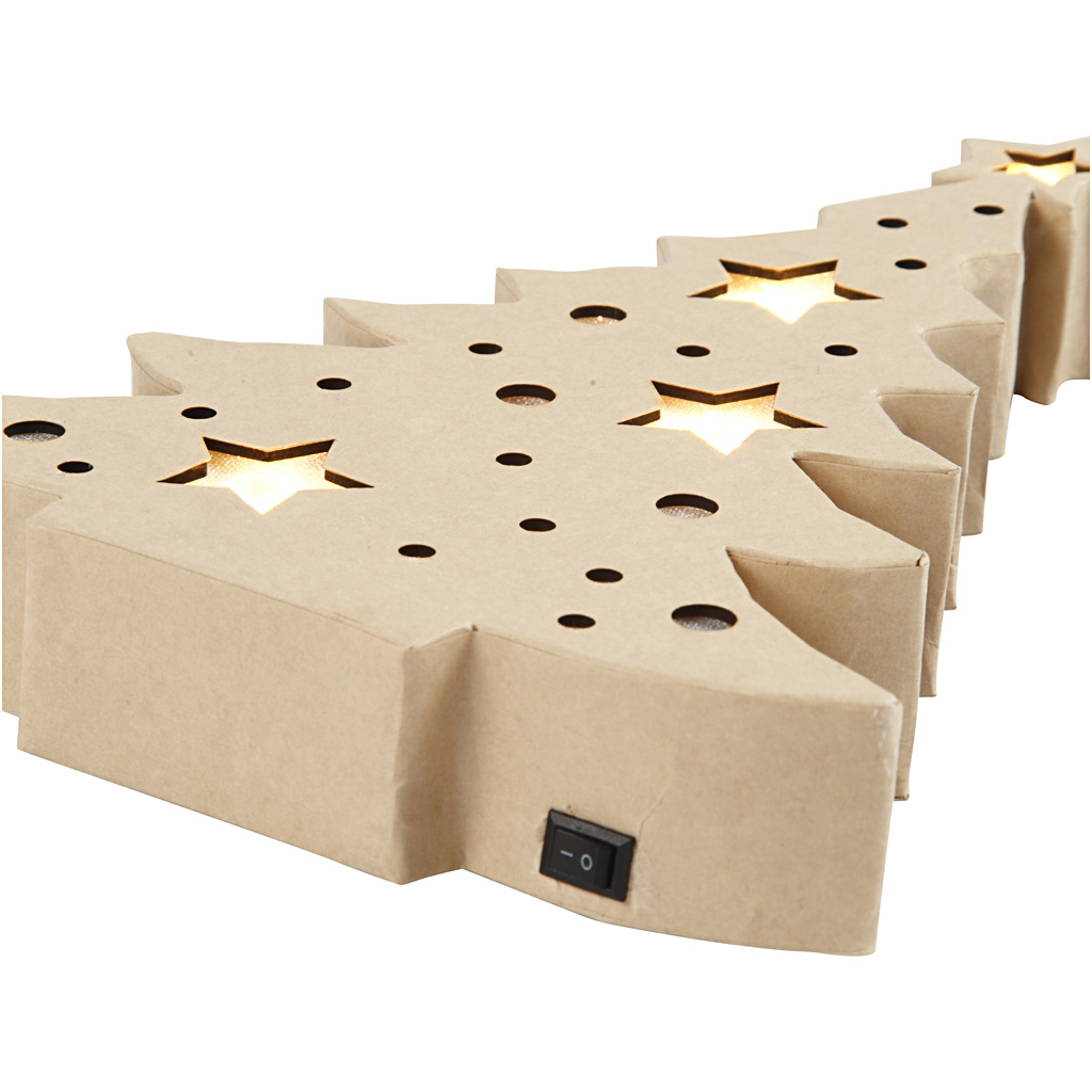 Vánoční dekorace z papír mache se světlem uvnitř na baterie. Je volně stojící a má vzadu zabudovanou krabičku na baterie a na boku kontakt pro zapnutí/vypnutí. Vydává teplé světlo skrze otvory, které jsou zakryty průhledným materiálem.