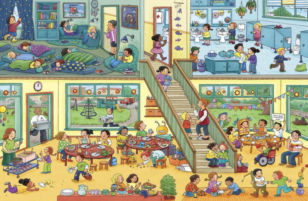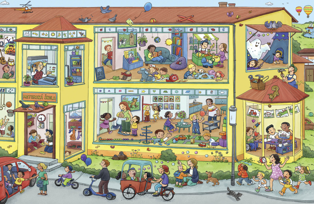 S touhle velkou obrázkovou knížkou prožijete úžasný den v mateřské školce, kde je pořád živo! Ráno sem děti doprovodí maminky a tatínkové a pak teprve začne ta pravá zábava! Někdo si hraje, někdo tvoří, jiní se učí, zpívají nebo třeba cvičí. A pak všichni hurá ven – i tam totiž čeká spousta dobrodružství… Co takhle krátký výlet za zvířátky na farmu? Zapomenout nesmíme ani na povinnosti: pěkně se společně najíst, umýt a jít si po obědě zdřímnout. Zítra se pak můžeme těšit na další setkání s kamarády. I malí čtenáři mohou prožívat školková dobrodružství znovu a znovu – stačí otevřít knížku a začít listovat od začátku!