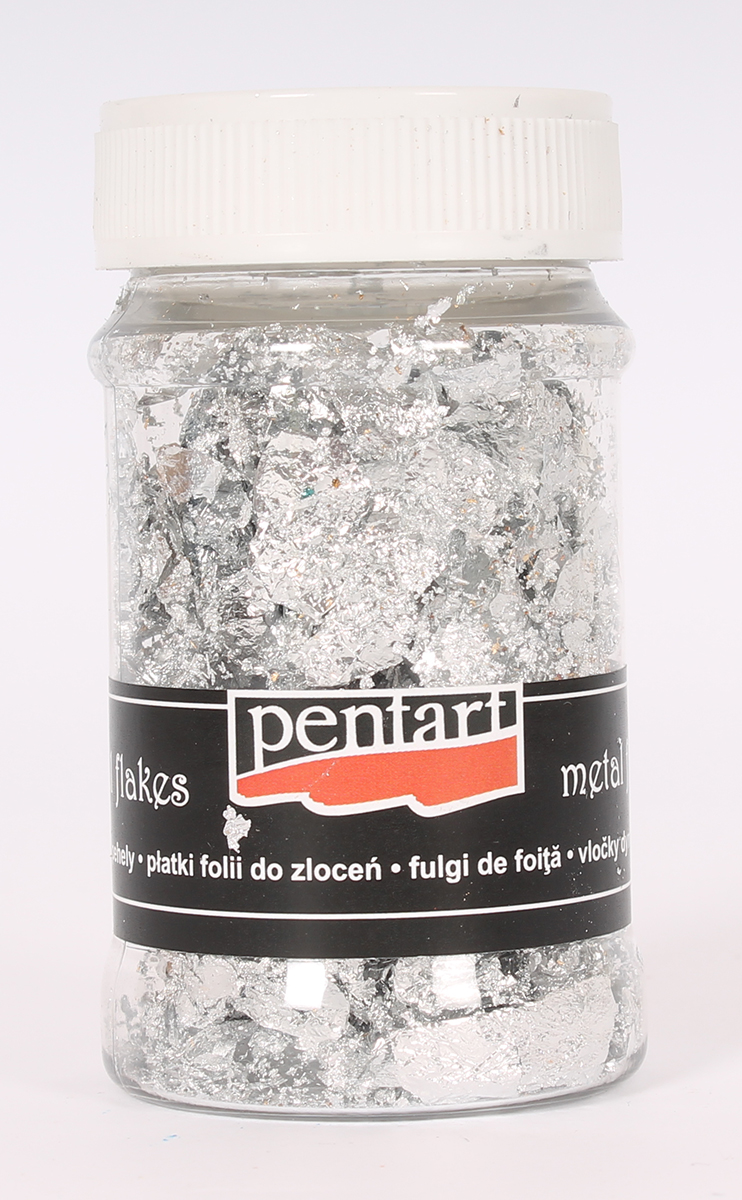 Vločky z metalické fólie v zajímavých barevných kombinacích, na vytvoření pozlaceného povrchu s mramorovým efektem. Na závěrečné přelakování použijte lesklý syntetický lak.